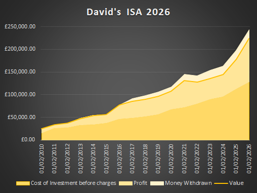 01/02/2026 – This is my Stocks & Shares ISA consisting of over 30 managed funds. Dark yellow line shows value over time. Darkest yellow block shows gross contributions. Medium yellow block shows profit and lightest yellow block shows money withdrawn. Everyone’s ISA will perform differently depending on funds held, amount invested, timescale and charges. £500 per month goes in (at the start it was only £50pm.) I sometimes make additional, lump sum contributions (£10,000 was added in September 2025) and have withdrawn money in the past. I charge the ISA 0.5% per annum for an investment performance review and overall annual charges are shown as 1.73%.