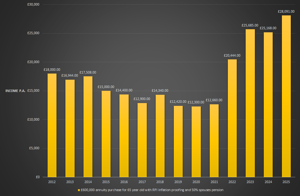 How much guaranteed annual income would £600,000 buy a healthy sixty five year old living in the south of England? Income is pegged to RPI inflation each year and would provide 50% spouse’s income if the purchaser dies first. This graph is a very rough indication only and is based on quotes obtained over the last 14 years.
